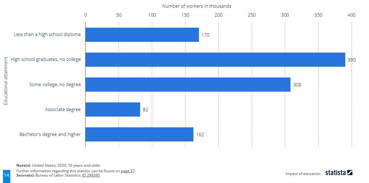 Number of employees paid below minimum wage in the US, by education (in thousands)